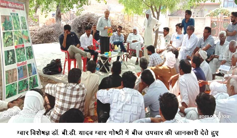 गोष्ठी के दौरान डॉ. यादव ने किसानों को विशेष सलाह दी कि इस क्षेत्र में पानी की कमी है और पानी का स्तर बहुत नीचे गिरता जा रहा है। इसलिए किसान पानी लगाकर ग्वार की बिजाई न करें। ग्वार की अच्छी पैदावार लेने के लिए जून का दूसरा पखवाड़ा बिजाई के लिए सबसे उचित है, परन्तु जिस किसान के पास अच्छी किस्म का फालतू पानी उपलब्ध है और ग्वार के बिजाई के लिए पानी लगाकर मध्य जून के महीने में बिजाई कर सकते हैं।