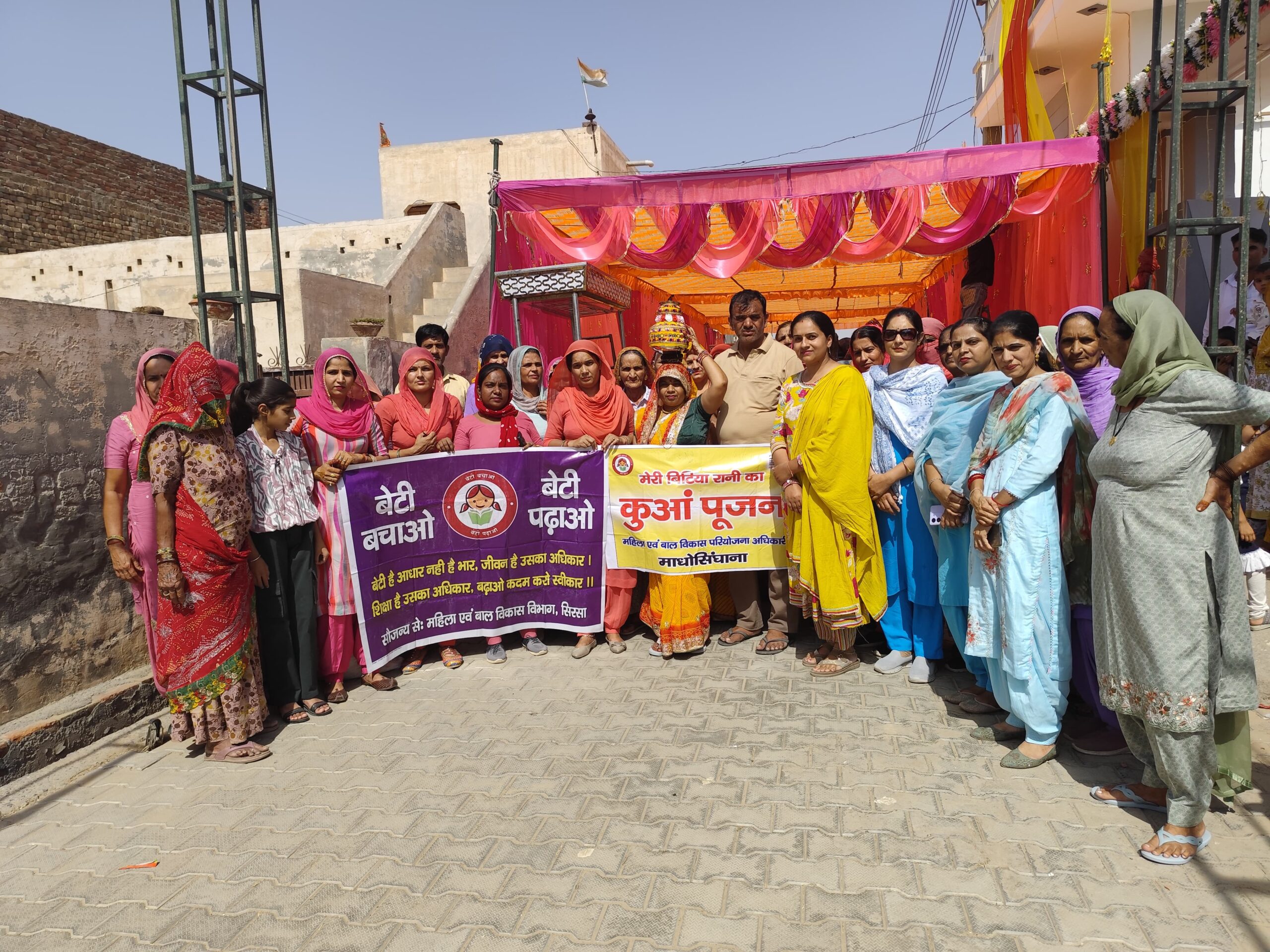 सिरसा। महिला एवं बाल विकास विभाग ने गांव माधोसिंघाना में बेटी के जन्म पर कुआं पूजन कार्यक्रम किया गया। कार्यक्रम सुपरवाइजर कुसुम शर्मा के नेतृत्व में हुआ। गांव के विजय सिंह और उनकी पत्नी माया के घर बेटी का जन्म हुआ। इसी उपलक्ष्य में गांव में कुआं पूजन कर जागरूकता अभियान चलाया गया। इस मौके पर पंच रणजीत सिंह और एएनएम ममता मौजूद रहीं। कार्यक्रम में बेटी बचाओ-बेटी पढ़ाओ का संदेश दिया गया। कन्या भू्रण हत्या जैसी बुराई को खत्म करने और बेटियों को जीने का समान अधिकार देने की प्रेरणा दी गई। सुपरवाइजर कुसुम ने बताया कि इस तरह के कार्यक्रमों का उद्देश्य समाज में जागरूकता फैलाना है। बेटी बचाओ-बेटी पढ़ाओ के साथ बेटी अपनाओ का नारा दिया गया। मकसद है कि बेटियों को भी बेटों के समान समझा जाए। उन्हें भी हर अवसर मिले। इस अवसर पर आंगनबाड़ी वर्कर सुमन, रोशनी, पूनम, बिमला, कमलेश, राधा, बलवंती, कमला, आशा वर्कर पूनम, एएनएम अमनप्रीत, सुखविंद्र और दर्शना भी मौजूद रहीं।