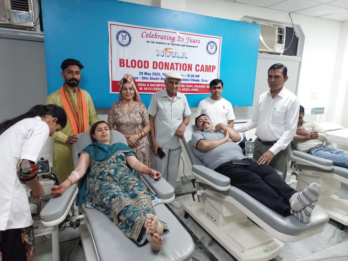सिरसा। टीम निफा सिरसा द्वारा महाराणा प्रताप जयंती के उपलक्ष्य में शिव शक्ति ब्लड सेंटर सिरसा में रक्तदान शिविर का आयोजन किया गया, जिसमें मुख्य अतिथि के रूप में रक्तदान के  क्षेत्र में महिलाओं के लिए प्रेरणास्त्रोत बनकर उभरी बिमला कसवां ने शिरकत की। बिमला कसवां ने कहा कि रक्त का कोई विकल्प नहीं है। न तो इसे किसी फैक्ट्री में पैदा किया जा सकता है और न ही इसका कोई और विकल्प है। रक्तदान ही एकमात्र इसका विकल्प है। बिमला कसवां ने कहा कि रक्तदान को लेकर खासकर महिलाओं में काफी भ्रांतियां है, लेकिन रक्तदान से शरीर में किसी प्रकार की कमजोरी नहीं आती। एक सप्ताह के खानपान से रक्त की पूर्ति हो जाती है। उन्होंने महिलाओं खासकर युवतियों से आह्वान किया कि वे घर का बना हुआ खाना खाएं, ताकि उनमें रक्त की कमी न आए। उन्होंने आमजन से भी आह्वान किया कि प्रत्येक स्वस्थ व्यक्ति साल में कम से कम दो बार अवश्य रक्तदान करे, ताकि किसी जरूरतमंद की जान बचाई जा सके। नव नृत्य डांस सेंटर के संयोजक एवं निफा सिरसा महिला विंग प्रधान तन्वी खुशबू मानव के नेतृत्व में आयोजित इस कैंप में  सामाजिक क्षेत्र में काम करने वाली हस्तियों ने भाग लिया। निफा हरियाणा महासचिव दलबीर सिंह ने शिविर की अध्यक्षता करते हुए कहा कि निफा संस्था की 25वीं वर्षगांठ पर टीम द्वारा रक्तदान शिविर लगाया गया है। जिसमें दर्जनों यूनिट रक्त एकत्रित किया गया। उन्होंने बताया कि संस्था द्वारा इससे पूर्व भी हजारों की संख्या में रक्तदान शिविर लगाए जा चुके हंै, जिसमें लाखों यूनिट एकत्रित किया जा चुका है। इस मौके पर कोऑर्डिनेटर निफा सिरसा रणजीत सिंह टक्कर, राजेंद्र पंडित खारिया, विजय कुमार, रामकिशन बैनीवाल, आंचल बैनीवाल, भागीरथ पटवारी, दीपक, सुखराम सचदेवा, हर्ष सेठी, जितेंद्र, हार्दिक, सुनीता, मास्टर विनोद सुथार सहित अनेक सामाजिक संस्थाओं के प्रतिनिधियों ने भाग लिया। शिव शक्ति से डा. आर एम अरोड़ा, अनिल कुमार जैन के सहयोग से रक्तदान शिविर का आयोजन हुआ।