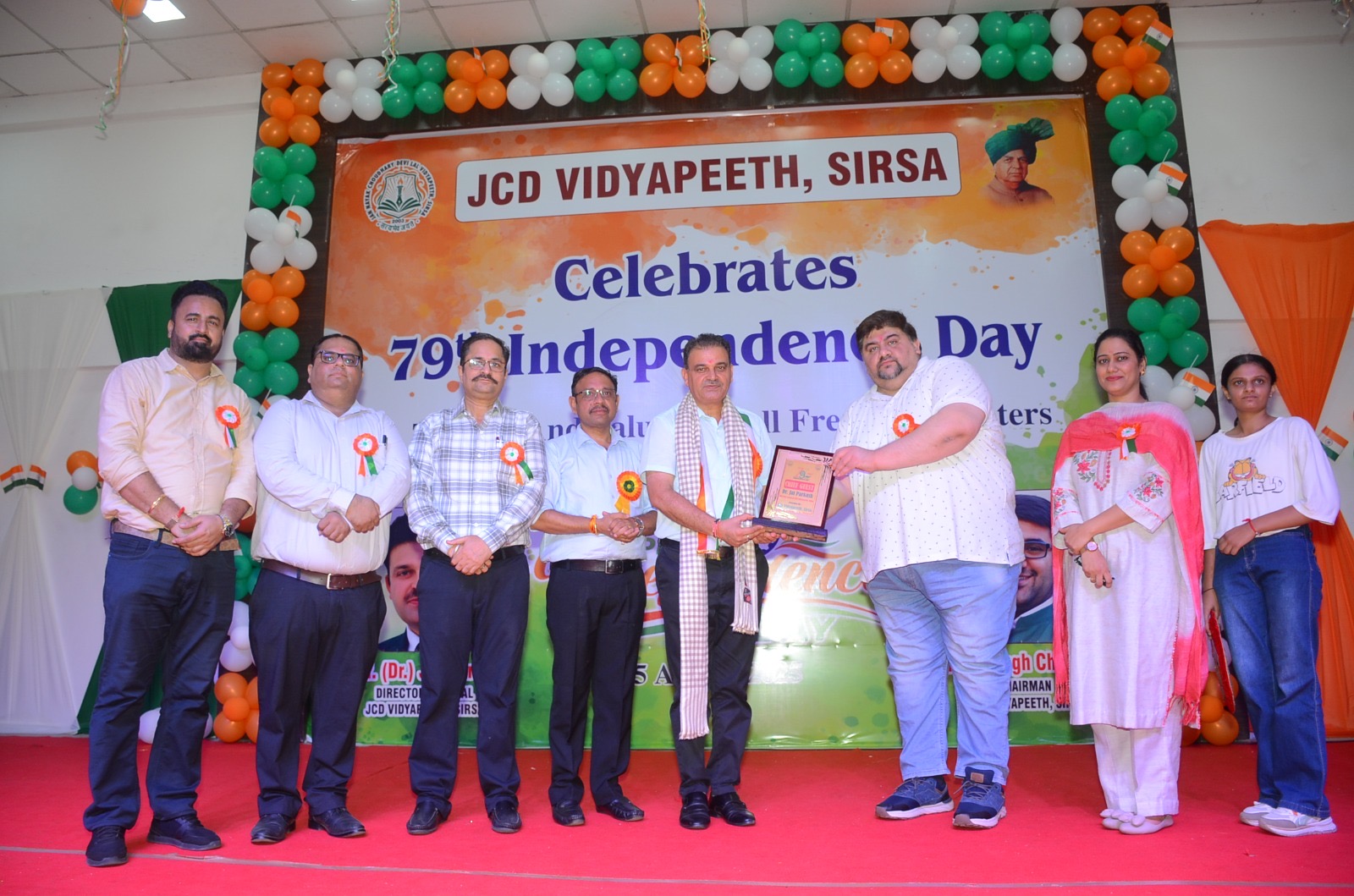 जेसीडी विद्यापीठ, सिरसा में 79वां स्वतंत्रता दिवस का पर्व देशभक्ति और सांस्कृतिक उत्साह के साथ मनाया गया। यह कार्यक्रम जेसीडी विद्यापीठ के एपीजे अब्दुल कलाम ऑडिटोरियम में आयोजित किया गया, जिसमें विद्यापीठ के सभी कॉलेजों के शिक्षकों, स्टाफ सदस्यों और छात्र-छात्राओं ने भाग लिया। कार्यक्रम का प्रारंभ जेसीडी विद्यापीठ के महानिदेशक एवं मुख्य अतिथि डॉ. जय प्रकाश ने ध्वजारोहण करके किया, जिसके पश्चात उपस्थित सभी लोगों ने राष्ट्रगान गाया।