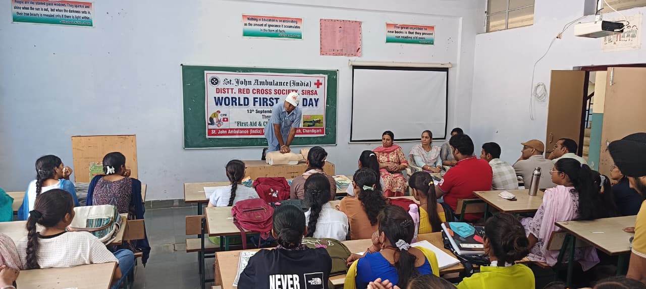 जिला रेडक्रॉस सोसायटी के सचिव लाल बहादुर बैनीवाल ने बताया कि आज पूरे विश्व में ‘‘विश्व प्राथमिक सहायता दिवस’’ मनाया जा रहा है। इस वर्ष की थीम ‘‘फर्स्ट एड एवं क्लाइमेट चेंज’’ को ध्यान में रखते हुए 11 से 13 सितम्बर 2025 तक जिले के विभिन्न विद्यालयों जैसे – राजकीय माध्यमिक विद्यालय काशी का बास, राजकीय उच्च विद्यालय मिठनपुरा, राजकीय माध्यमिक विद्यालय मीरपुर, अहमदपुर, शहीदांवाली, जिला शैक्षिक प्रशिक्षण संस्थान डिंग तथा महाविद्यालयों जैसे – राजकीय महिला महाविद्यालय सिरसा, जे.सी.डी. पी.जी. कॉलेज, जे.सी.डी. कॉलेज ऑफ एजुकेशन सिरसा, नेशनल कॉलेज ऑफ एजुकेशन सिरसा और लॉर्ड शिवा स्कूल ऑफ नर्सिंग में डमी प्रैक्टिकल के माध्यम से प्राथमिक सहायता व सीपीआर की विस्तृत जानकारी प्रदान की गई।