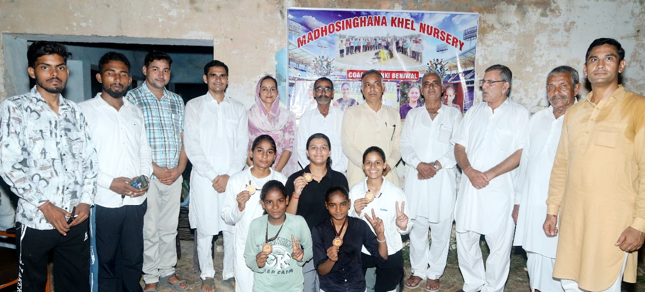 चौपटा (शिवशंकर सहारण)माधोसिंघाना गांव की क्रिकेट खेल नर्सरी में प्रशिक्षण ले रही 5 बालिकाओं ने स्टेट लेवल ट्रायल में चयनित होकर क्षेत्र का नाम रोशन किया है। इस क्रिकेट खेल नर्सरी में कोच पिकी बैनीवाल की मेहनत रंग लाई जिससे चारु छिंपा, स्नेहा, समीक्षा, लक्षिका और सुनीता का चयन अंडर-17 और अंडर-19 वर्ग में हुआ। इस उपलब्धि के लिए बुधवार को ग्राम पंचायत माधोसिंघाना की ओर से खिलाडियों और कोच के सम्मान में एक भव्य कार्यक्रम आयोजित किया गया। इस कार्यक्रम में ग्राम पंचायत सरपंच विनोद जांदू, ओम प्रकाश शर्मा, गौशाला प्रधान रमेश पोटलिया, जनक सैनी, सतबीर बेनीवाल, विनोद यादव, अनिल बिरडा, भारत भूषण धायल, सनी चालिया सहित खिलाड़ी के परिजन और अनेक खेल प्रेमी उपस्थित रहे।