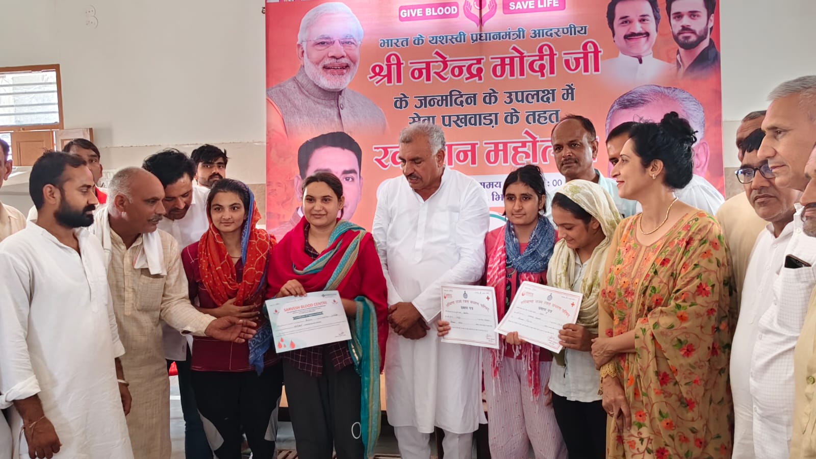 हिसार। भिवानी रोहिल्ला में देश के प्रधानमंत्री नरेंद्र मोदी के जन्मदिन पखवाड़े ब्लॉक समिति हिसार 2 के तहत गांव भिवानी रोहिल्ला में रक्तदान शिविर का आयोजन किया गया है। इस दौरान लोगों ने रक्तदान शिविर में बढ़ चढ़ कर भाग लिया। रक्तदान शिविर की शुरुआत मुख्य अतिथि नलवा के विधायक रणधीर पनिहार द्वारा की गई जबकि कार्यक्रम की अध्यक्षता पंचायत समिति के चेयरमैन अजय गावड ब्लॉम द्वारा की गई। अजय गावड ने युवाओं से अपील करते हुए कहा कि दान दिया हुआ रक्त किसी का जान बचा सकता है इसलिए युवाओं को हमेशा रक्तदान करना चाहिए। उन्होंने कहा कि देश के प्रधानमंत्री नरेंद्र मोदी ने भारत देश को विश्व स्तर बुलंदियों तक पहुंचाने का काम किया है। समापन अवसर पर रख देने वाले युवाओं को प्रमाण पत्र भी वितरित किए गए इस मौके पर भाजपा वरिष्ठ नेता दलवीर, युवा नेता सियाराम, भीम जयानी सरपंच बलजीत, मंडल महामंत्री रविशंकर, ब्लॉक समिति सदस्य सोनू लोहार, पिंकू चौधरीवास, संदीप कासनियां , सुभाष जेनेवा कैलाश शर्मा, सुनील शर्मा, विकास शर्मा, प्रदीप बैनीवाल, प्रदीप खारिया, राहुल, दीपांशु, सुरेन्द्र गोस्वामी, कुलदीप, व् डॉक्टर टीम सहित अन्य गणमान्य लोग मौजूद थे।
